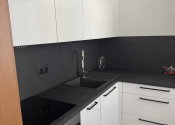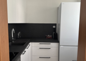 Kuchyňa: kuchynská linka so zabudovanými spotrebičmi – digestor, indukčná varná doska, elektrická multifunkčná rúra, základný kuchynský inventár, chladnička s mrazničkou