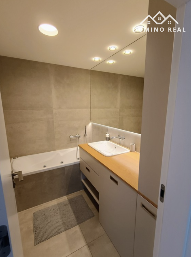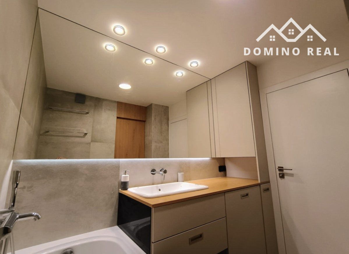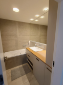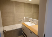 Kúpeľňa ponúka masážnu vaňu, prémiovú sanitu a oddeleným WC, pračkou so sušičkou.